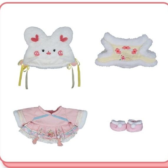 4点セット 20cm 着せ替えぬいぐる服 ぬいぐるみ用服コスチューム 着せ替え人形洋服 絨兔桃桃帽子ワンピース靴 日常服人形ミニ洋服 綿人形衣装 ドールウェア アクセサリー
