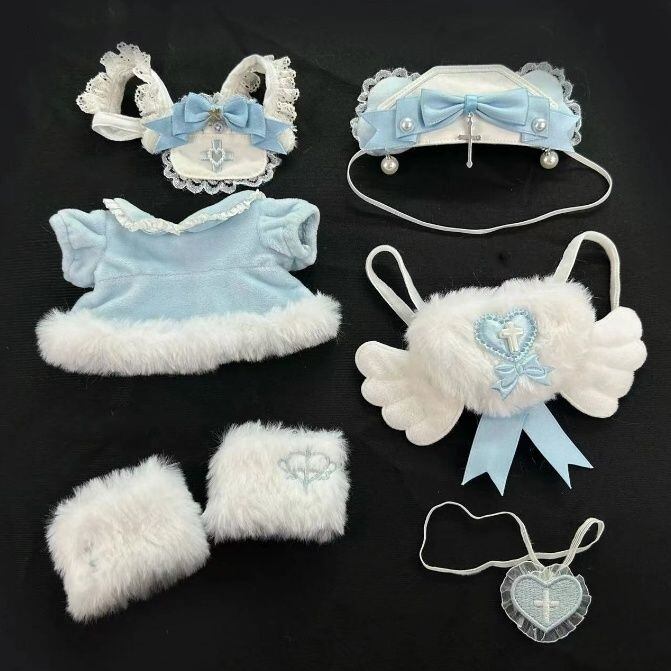6点セット 20cm 着せ替えぬいぐるみ用服 コスチューム ブルー エプロン ドレス ヘッドギア バックパック アイマスク レッグウォーマー